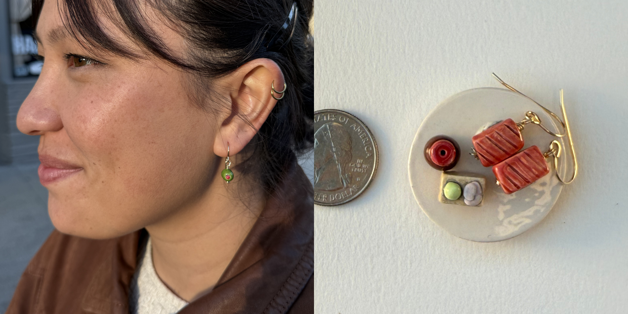 Each meshi charm is hand-built from earthenware, finished with translucent and opaque underglazes and glazes, and fired in a solar-powered electric kiln. The earrings are assembled with handmade gold-filled headpins and gold-filled earwire loops.